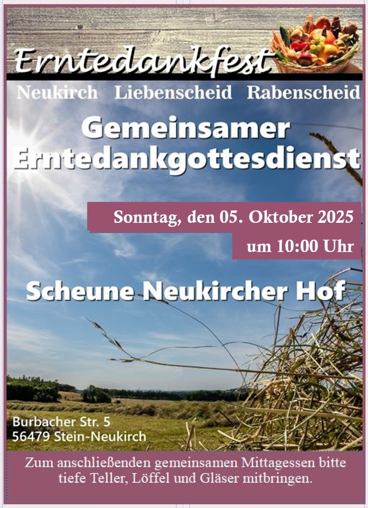 Herzliche Einladung zum gemeinsamen Erntedankgottesdienst am 05. Oktober um 10:00 Uhr auf der Neukirch in „Grünschlags Scheune“.
